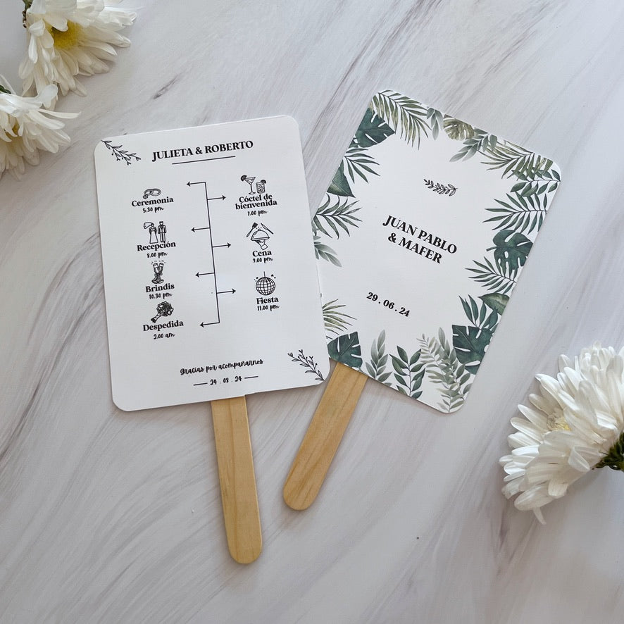 Abanicos de papel con impresión a color por los dos lados, son rígidos por lo que son super eficientes, de un lado puedes poner el cronograma de tu evento y ayudar a tus invitados a conocer más sobre que les espera en este día tan especial. IDEALES para los hombres durante la ceremonia.