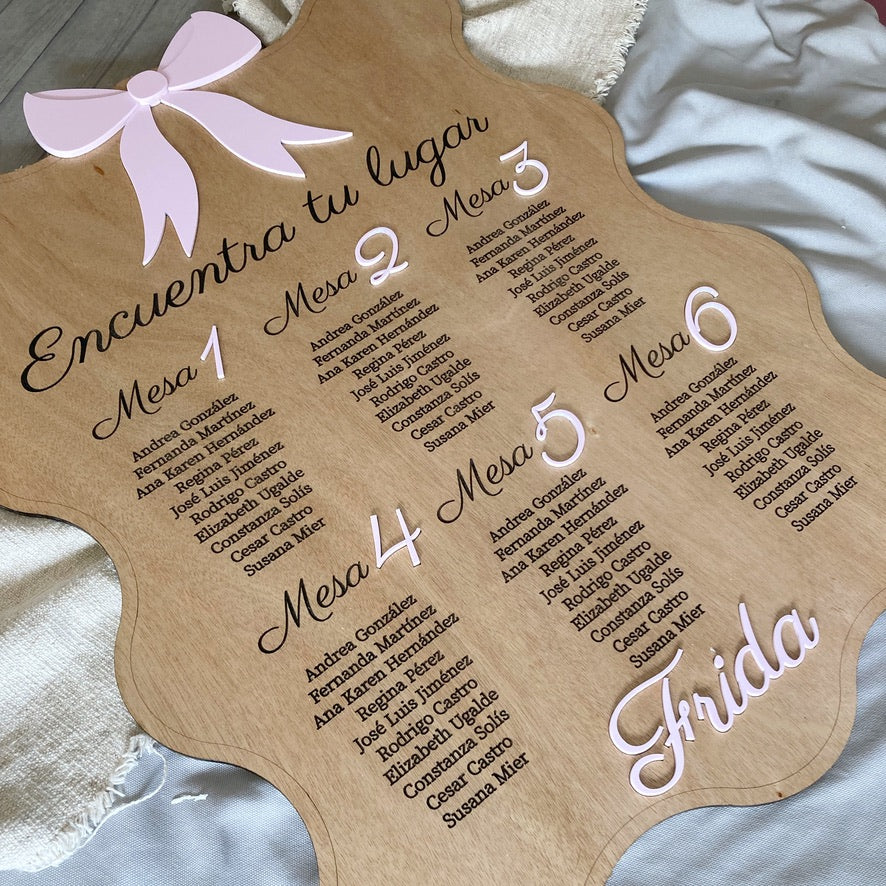 Welcome board con lista y numero de mesa, para que tus invitados encuentren en dónde sentarse en tus XV años!