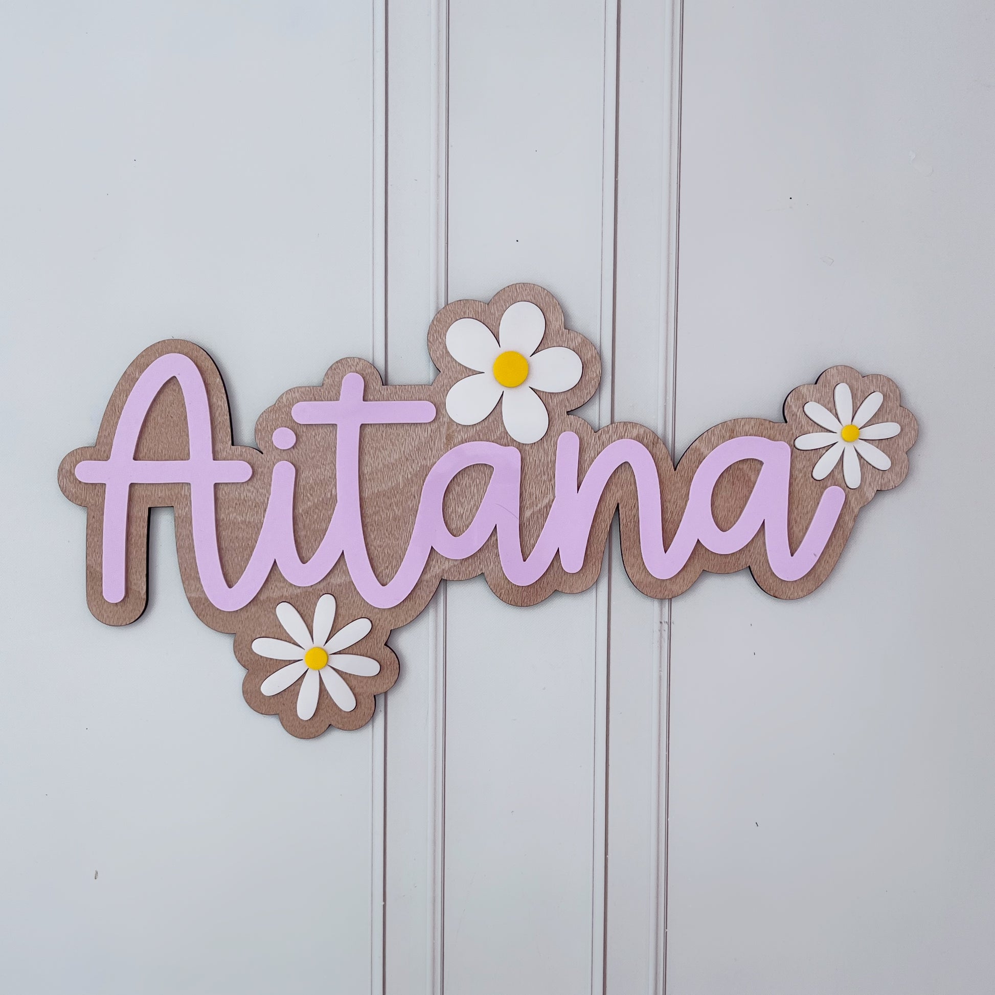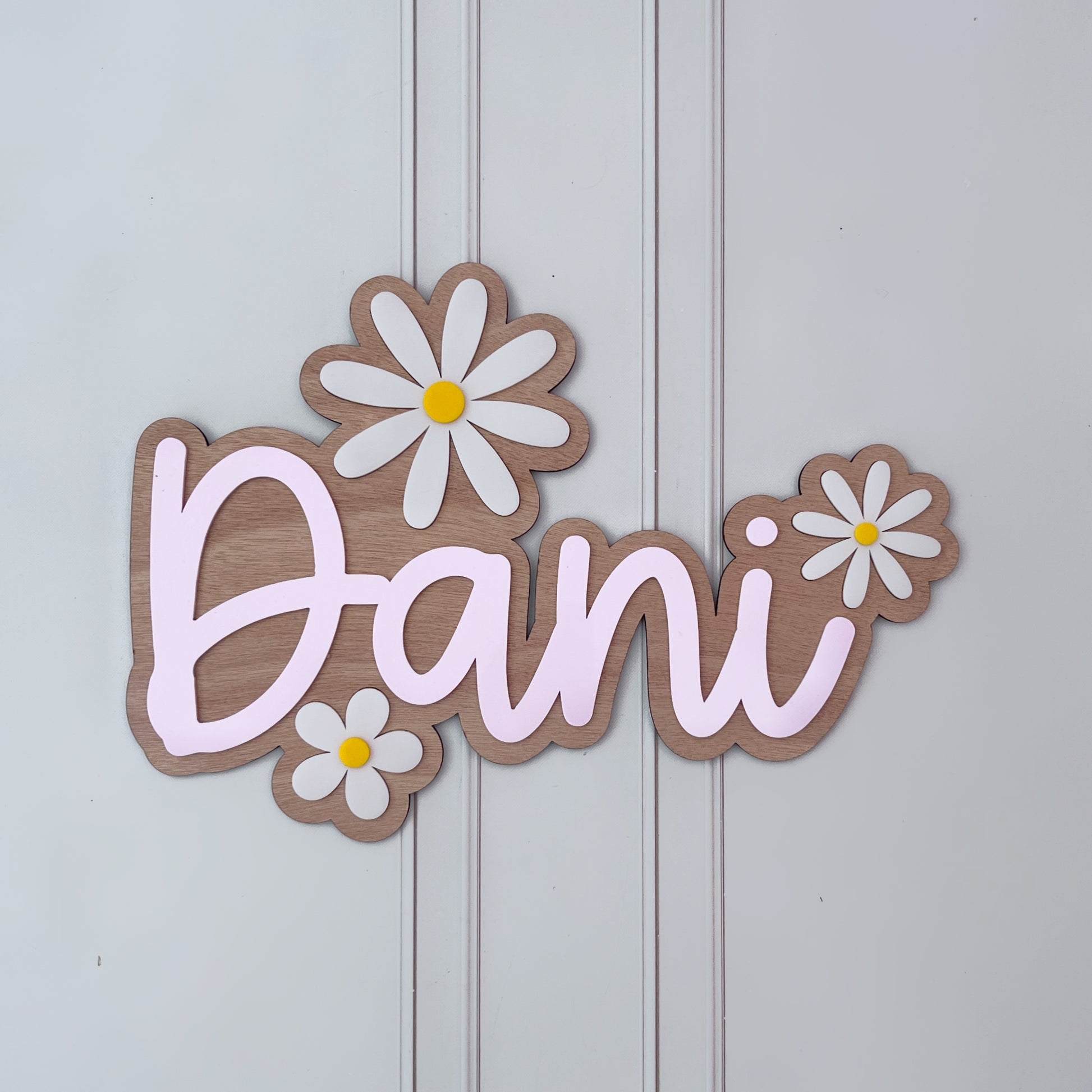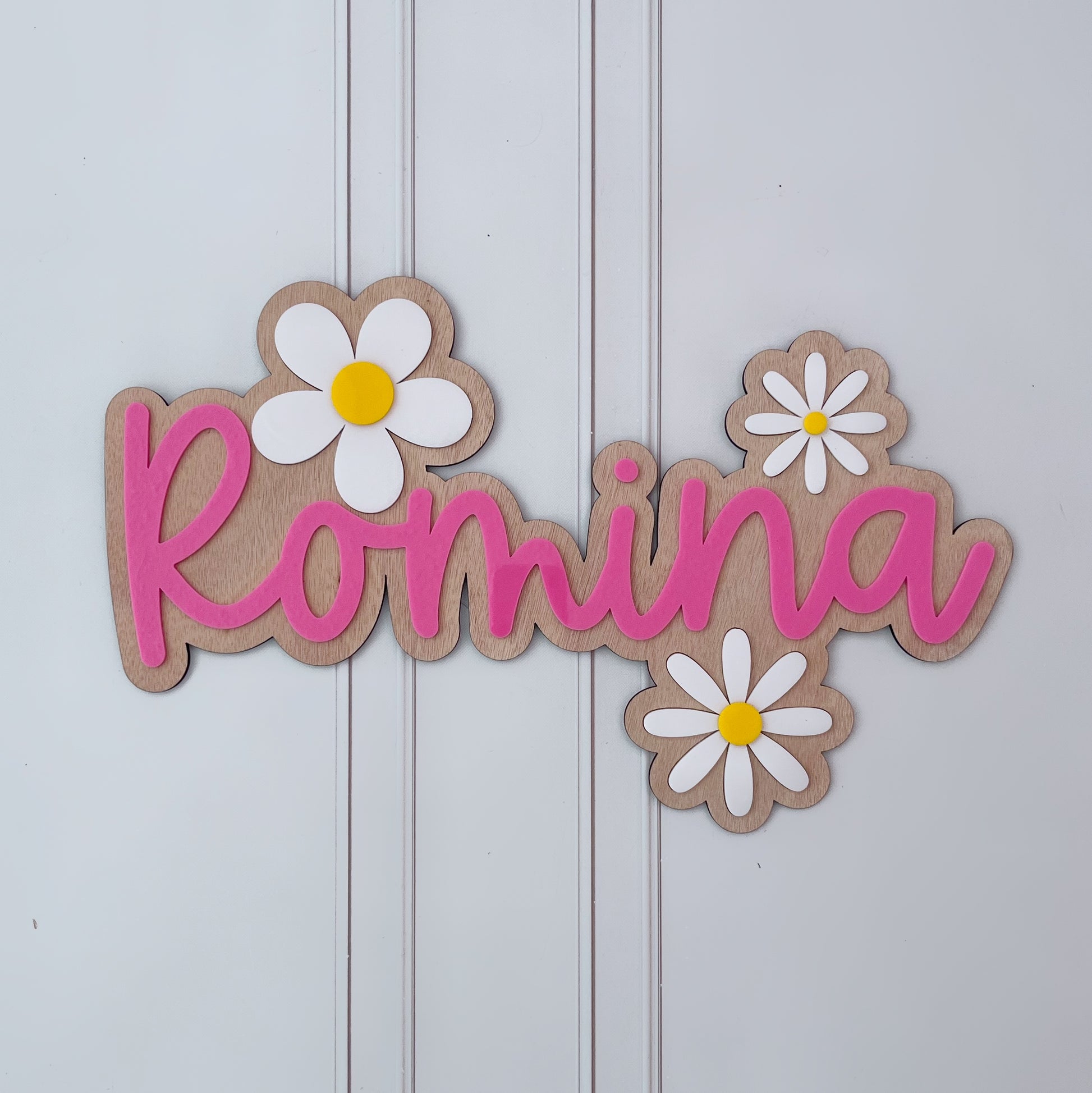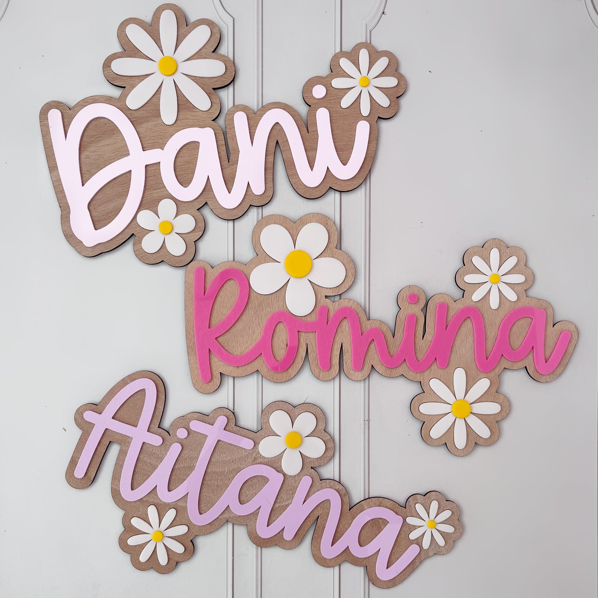 Letrero de nombre personalizado, decorado con margaritas blancas.
