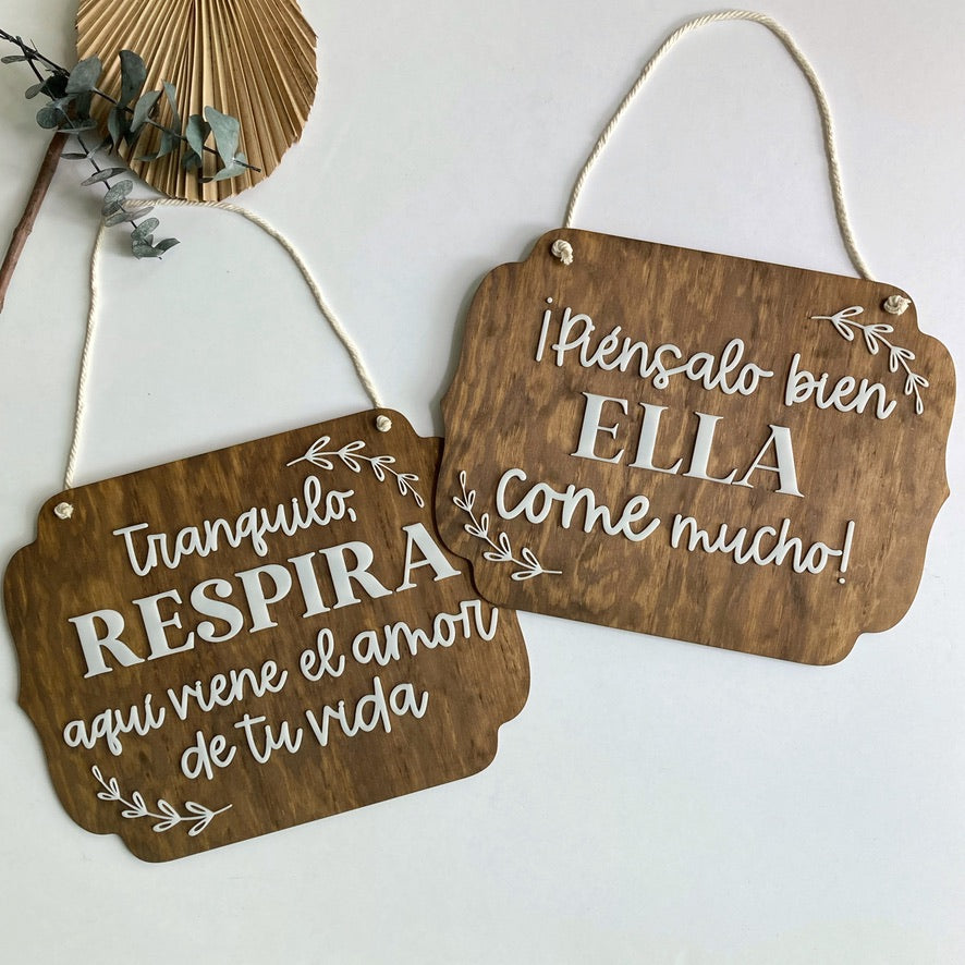 Fabricado en Triplay de pino entintado en nogal con letras en acrílico blanco brillante y cuerda de algodón.