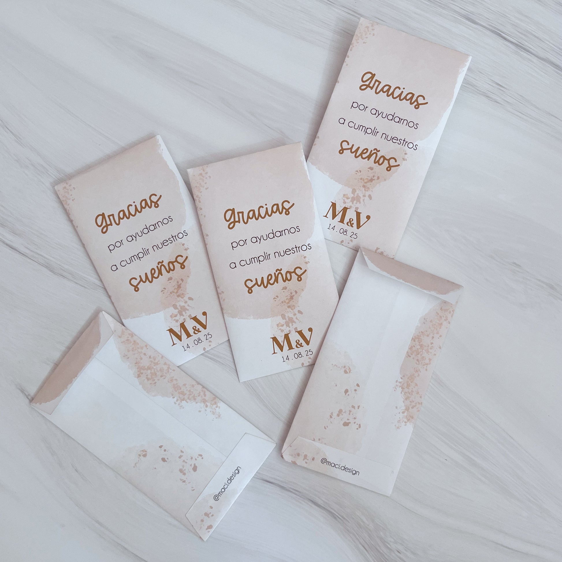 Sobres de papel personalizados, ideales para cualquier evento en donde se pida una cuota voluntaria como regalo.