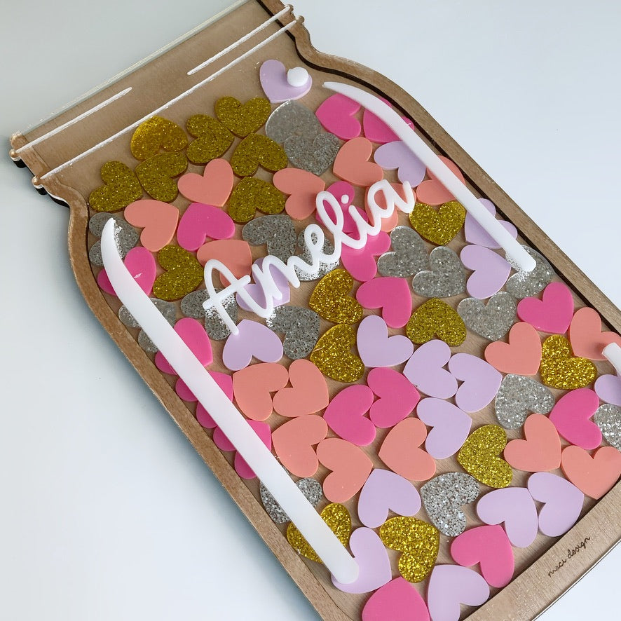 Tarro Motivacional fabricado con corazones de colores Rosa mexicano, salmón, dorado, plateado y lila.