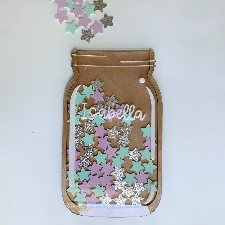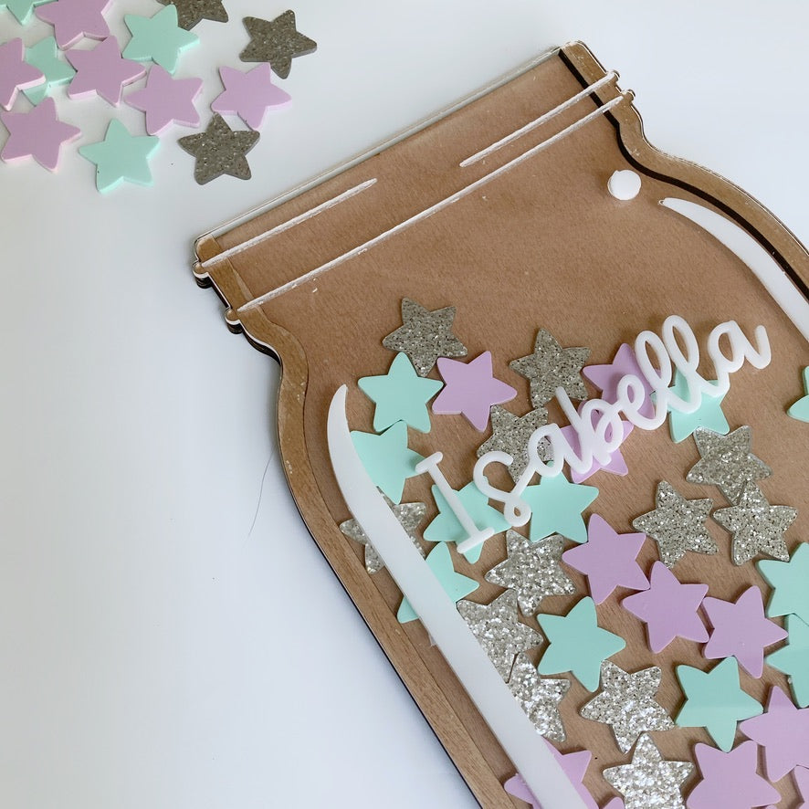 Tarro Motivacional fabricado con estrellas de colores lilia, plata y verde agua.
