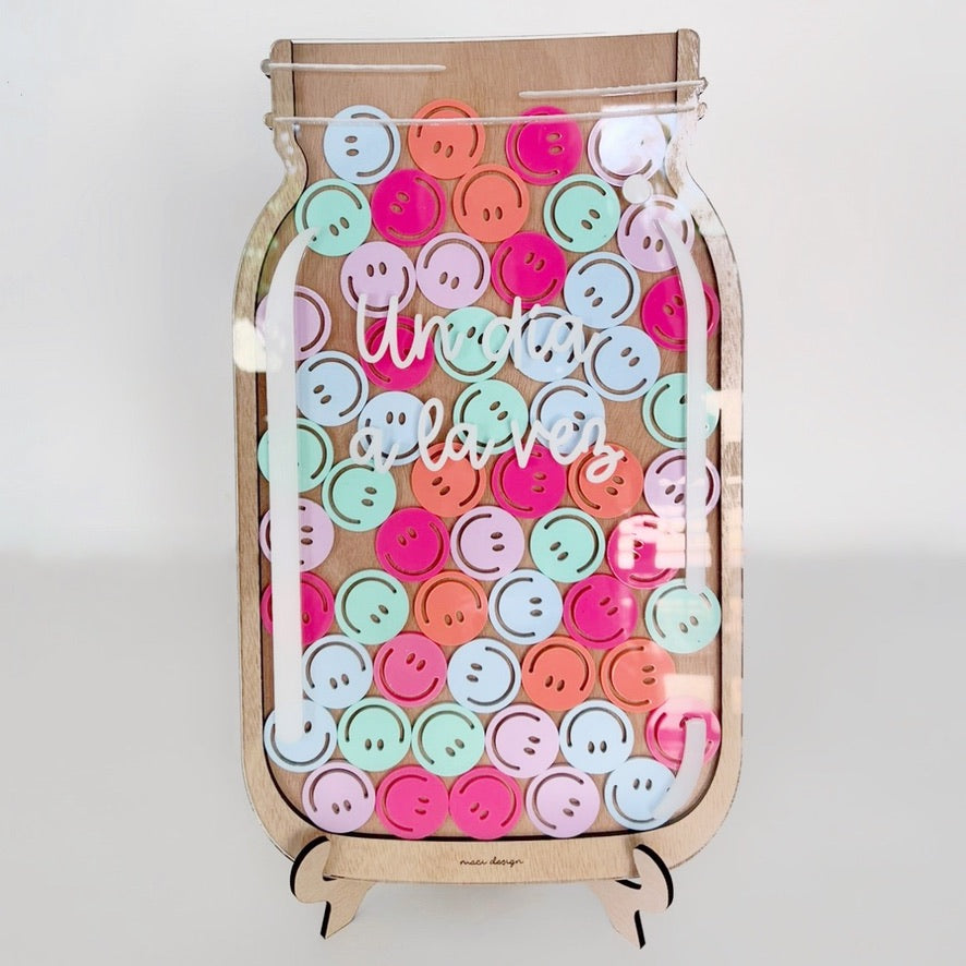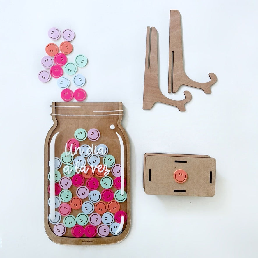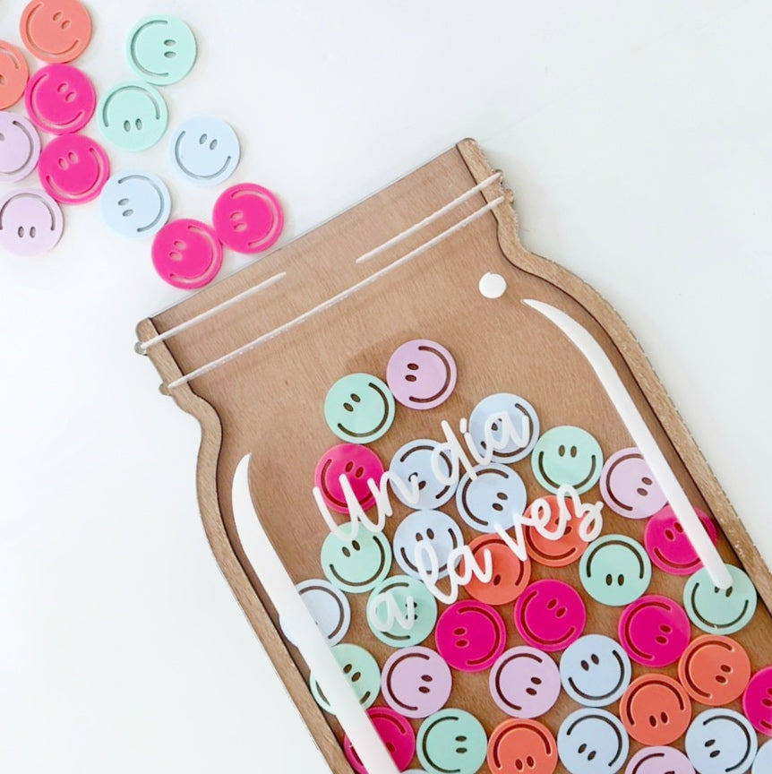 Tarro Motivacional fabricado con caritas felices de colores rosa mexicano, lila, verde agua, azul claro y salmón.